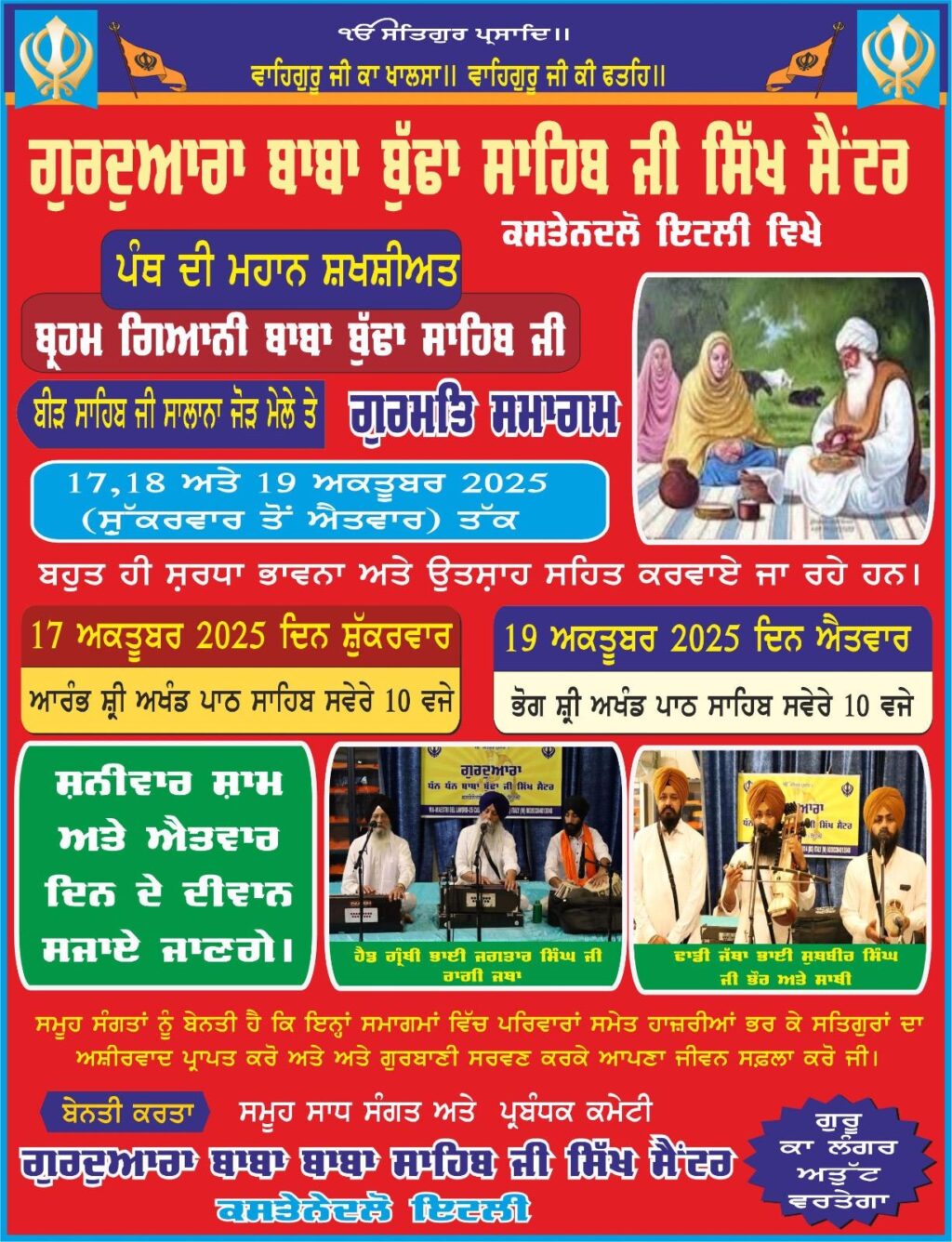 ਰੋਮ(ਦਲਵੀਰ ਸਿੰਘ ਕੈਂਥ)ਮਹਾਨ ਸਿੱਖ ਧਰਮ ਦੀ ਵਿਲੱਖਣ ਤੇ ਸਤਿਕਾਰਤ ਸਖ਼ਸੀਅਤ ਬਾਬਾ ਬੁੱਢਾ ਜੀਓ ਜਿਹਨਾਂ ਨੇ 5 ਗੁਰੂ ਸਾਹਿਬਾਨ ਨੂੰ ਗੁਰਗੱਦੀ ਦਾ ਤਿਲਕ ਲਗਾਇਆ ਅਤੇ 100 ਸਾਲ ਤੋਂ ਵੀ ਵੱਧ ਸਮੇਂ ਤੱਕ 6 ਗੁਰੂ ਸਾਹਿਬਾਨ ਨਾਲ ਬਹੁਤ ਨੇੜਿਓਂ ਜੁੜੇ ਰਹੇ।ਬਾਬਾ ਬੁੱਢਾ ਜੀਓ ਸਿੱਖ ਧਰਮ ਦੇ 11ਵੇਂ ਗੁਰੂ ਗ੍ਰੰਥ ਸਾਹਿਬ ਜੀਓ ਦਾ ਸ਼੍ਰੀ ਸ਼੍ਰੀ ਹਰਿਮੰਦਰ ਸਾਹਿਬ ਪ੍ਰਕਾਸ਼ ਕਰਨ ਵਾਲੇ ਪਹਿਲੇ ਗ੍ਰੰਥੀ ਸਨ ਅਜਿਹੀ ਰੱਬੀ ਰੂਹ ਨੂੰ ਸਮਰਪਿਤ ਬੀੜ ਸਾਹਿਬ ਜੀ ਸਲਾਨਾ ਜੋੜ ਮੇਲੇ ਤੇ ਗੁਰਮਤਿ ਸਮਾਗਮ 17,18 ਅਤੇ 19 ਅਕਤੂਬਰ 2025 ਦਿਨ ਸ਼ੁੱਕਰਵਾਰ,ਸ਼ਨੀਵਾਰ ਅਤੇ ਐੈਤਵਾਰ ਨੂੰ ਬਹੁਤ ਹੀ ਸ਼ਰਧਾ ਭਾਵਨਾ ਅਤੇ ਉਤਸ਼ਾਹਪੂਰਵਕ ਲੰਬਾਰਦੀਆ ਸੂਬੇ ਦੇ ਪ੍ਰਸਿੱਧ ਗੁਰਦੁਆਰਾ ਸਾਹਿਬ ਬਾਬਾ ਬੁੱਢਾ ਸਾਹਿਬ ਜੀ ਸਿੱਖ ਸੈਂਟਰ ਕਸਤੇਨਦਲੋ (ਬਰੇਸੀਆ)ਇਟਲੀ ਵਿਖੇ ਕਰਵਾਏ ਜਾ ਰਹੇ ਹਨ।