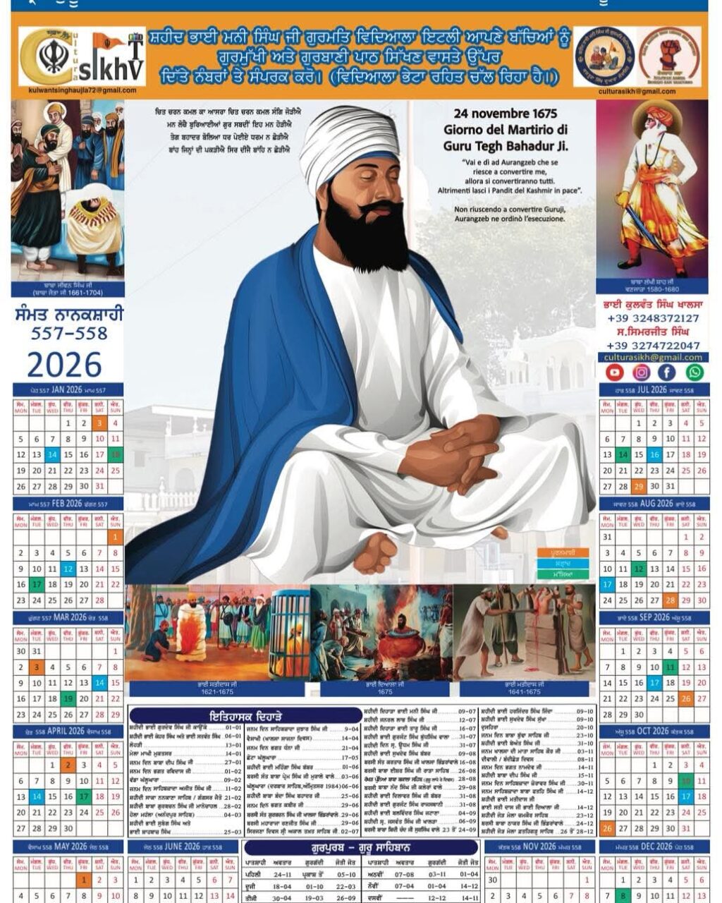 ਬਰੇਸ਼ੀਆ(ਦਲਵੀਰ ਸਿੰਘ ਕੈਂਥ) ਕਲਤੂਰਾ ਸਿੱਖ ਇਟਲੀ ਵਿੱਚ ਸਿੱਖ ਨੌਜਵਾਨ ਪੀੜ੍ਹੀ ਨੂੰ ਗੁਰੂ ਨਾਨਕ ਦੇ ਘਰ ਨਾਲ ਜੋੜਨ ਲਈ ਯਤਨਸੀਲ ਇਟਲੀ ਦੀ ਸਿਰਮੌਰ ਸਿੱਖ ਸੰਸਥਾ ਕਲਤੂਰਾ ਸਿੱਖ ਇਟਲੀ ਵੱਲੋਂ ਆਪਣਾ 9ਵਾਂ ਸਿੱਖੀ ਦੀਆਂ ਬਾਤਾਂ ਪਾਉਂਦਾ ਨਵੇਂ ਸਾਲ 2026 ਦਾ ਕਲੰਡਰ ਇਸ ਸਾਲ ਸ਼੍ਰੀ ਗੁਰੂ ਤੇਗ ਬਹਾਦਰ ਸਾਹਿਬ ਜੀ ਅਤੇ ਭਾਈ ਮਤੀ ਦਾਸ ਜੀ, ਭਾਈ ਸਤੀ ਦਾਸ ਜੀ, ਭਾਈ ਦਿਆਲਾ ਜੀ ਗੁਰੂ ਸਾਹਿਬ ਨਾਲ ਸ਼ਹੀਦ ਹੋਏ